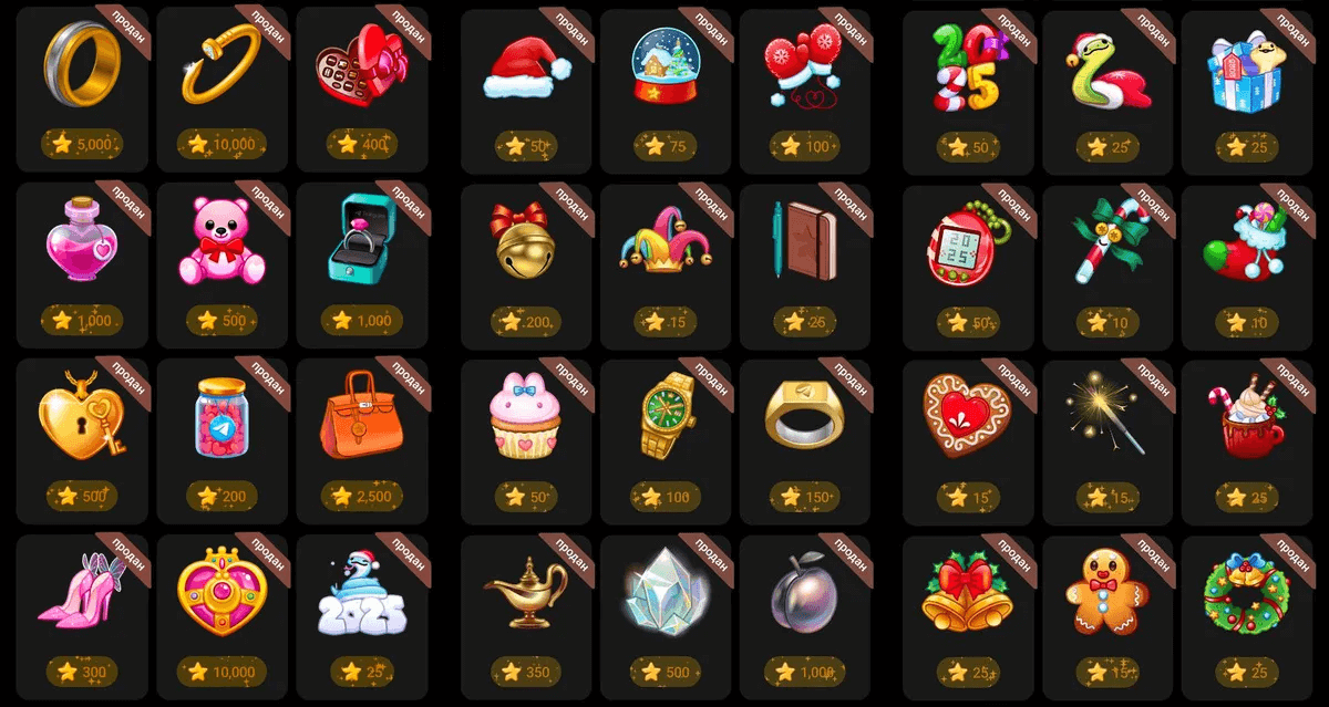 - Обычные подарки: Покупаются за Stars. Минимальная стоимость подарка начинается от 15 Stars. Stars, в свою очередь, покупаются за реальные деньги.
